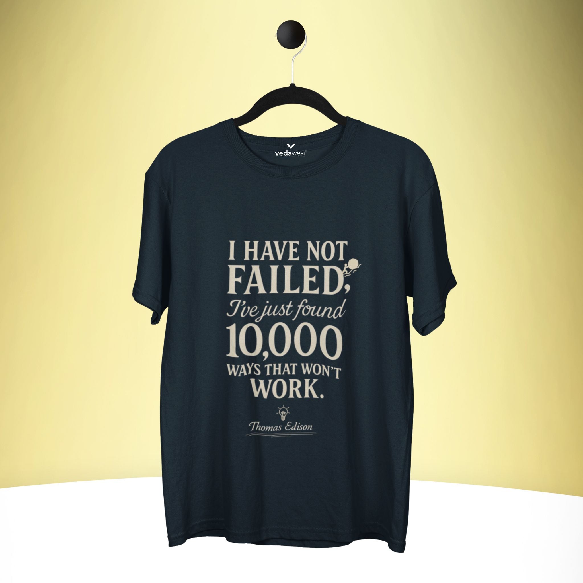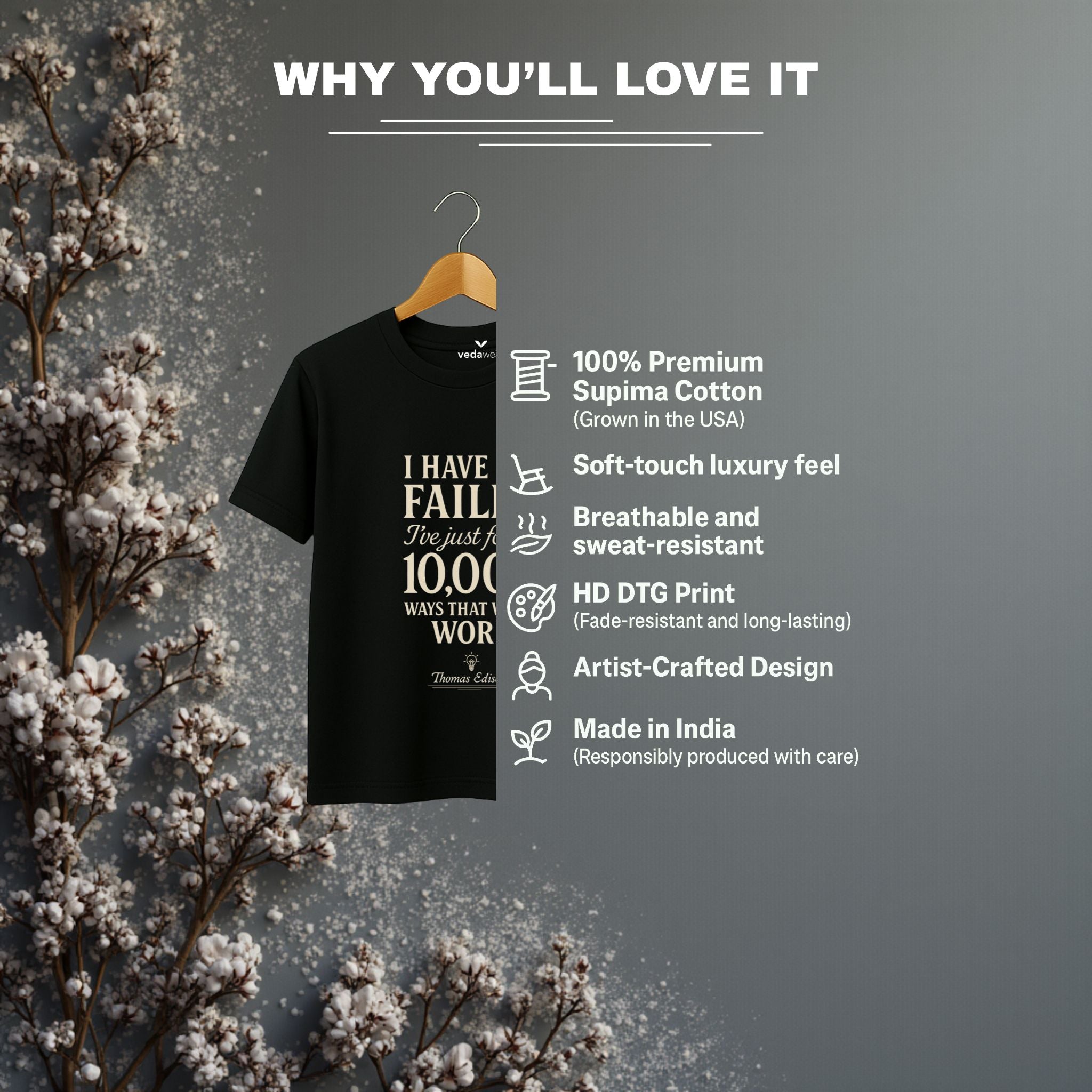 The design uses a blend of classic serif and elegant cursive fonts, emphasizing “FAILED” and “10,000” to reflect both struggle and scale. A tiny glowing light bulb icon above the text ties the design visually to Edison’s legacy. Printed in a soft ivory-gold tone, the design is DTG optimized for clarity on premium black cotton.