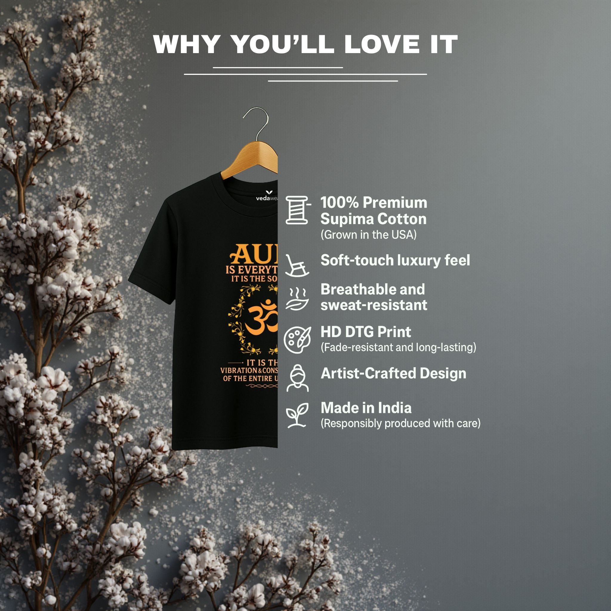 The “AUM Is Everything” premium tee by Vedawear honors the primordial sound of the universe — AUM (ॐ), the eternal vibration from which all existence flows.