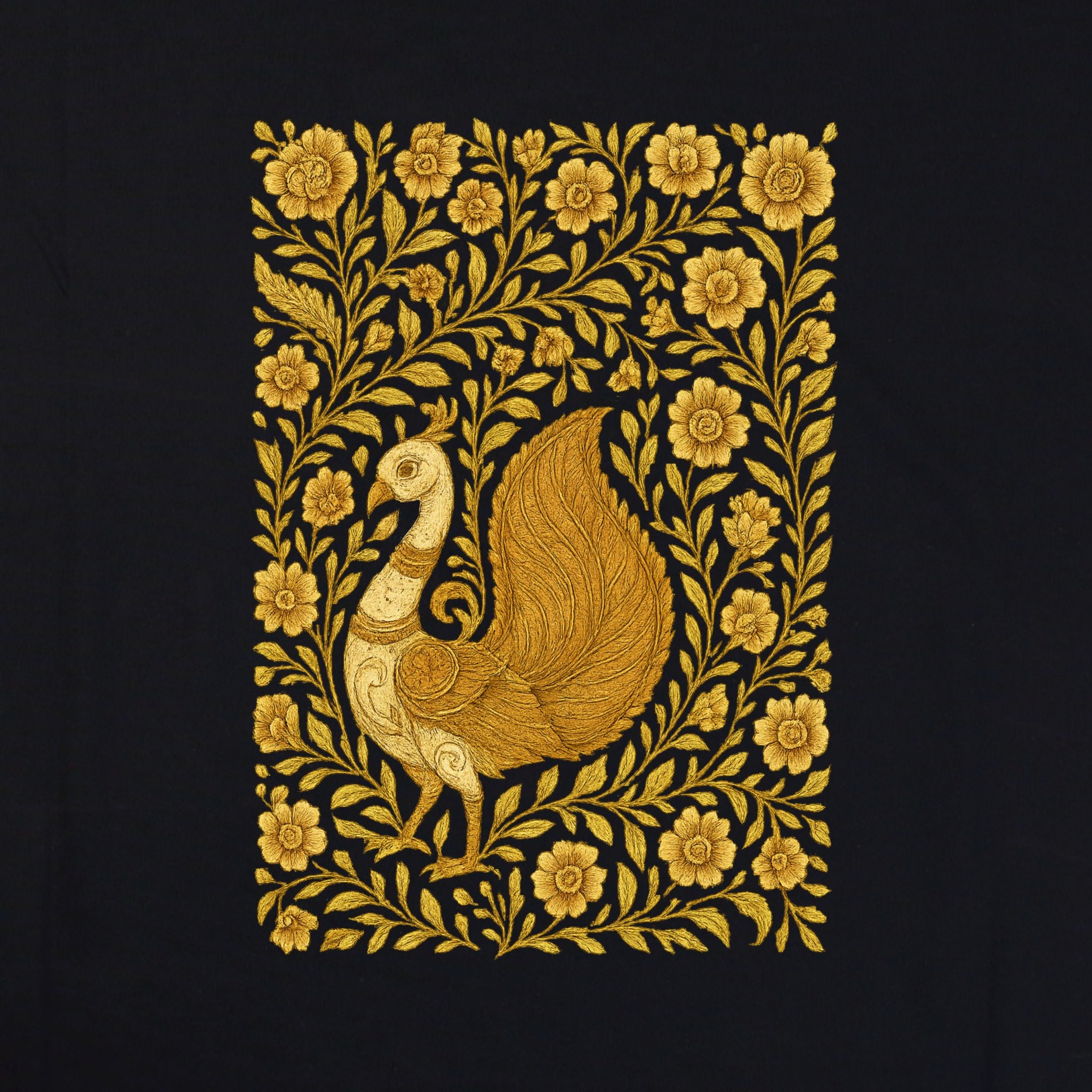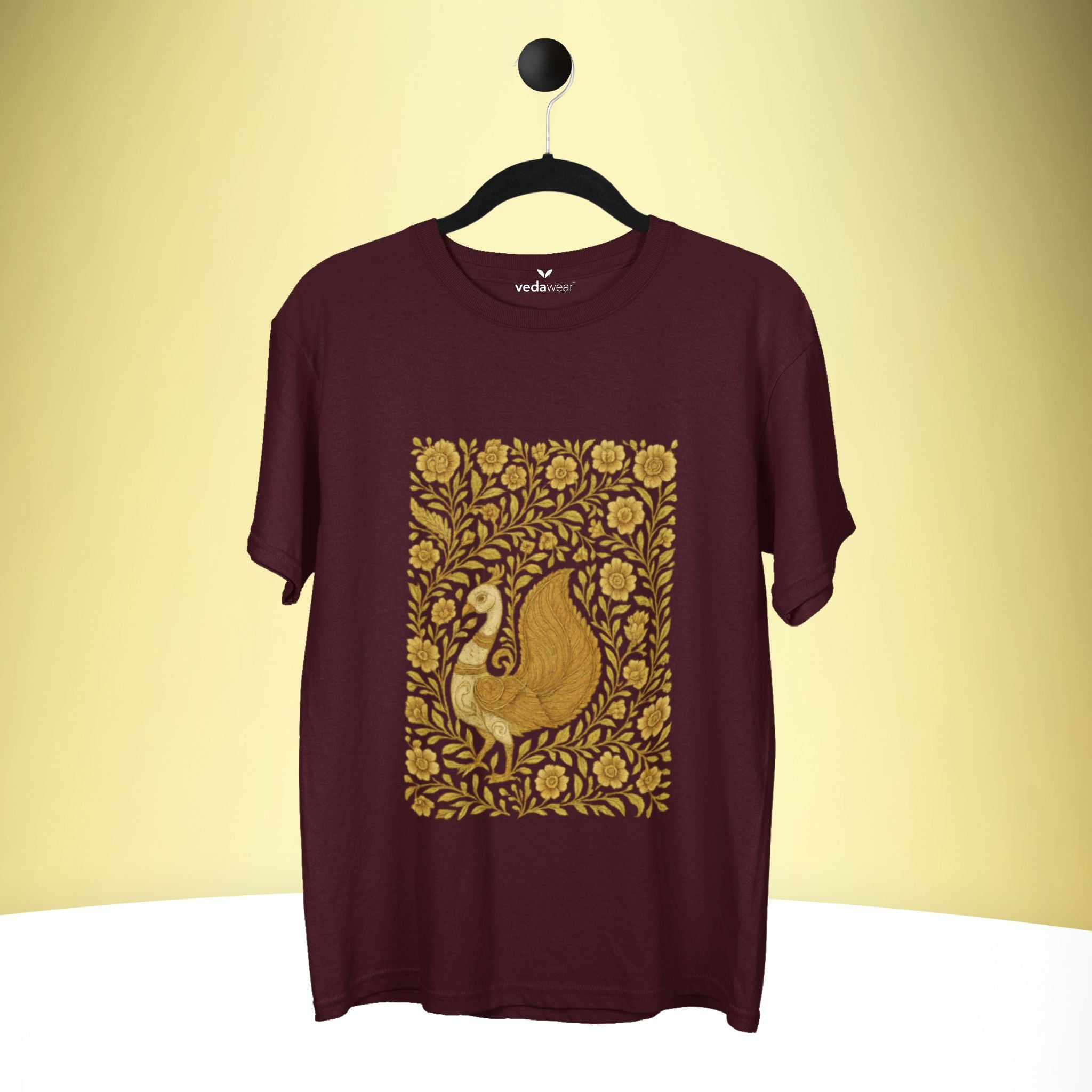 Step into timeless tradition with the Golden Grace – Kalamkari Folk Peacock Premium Tee. This masterpiece draws inspiration from India’s ancient Kalamkari art, featuring a majestic golden peacock surrounded by intricate floral patterns—symbolizing prosperity and grace.
