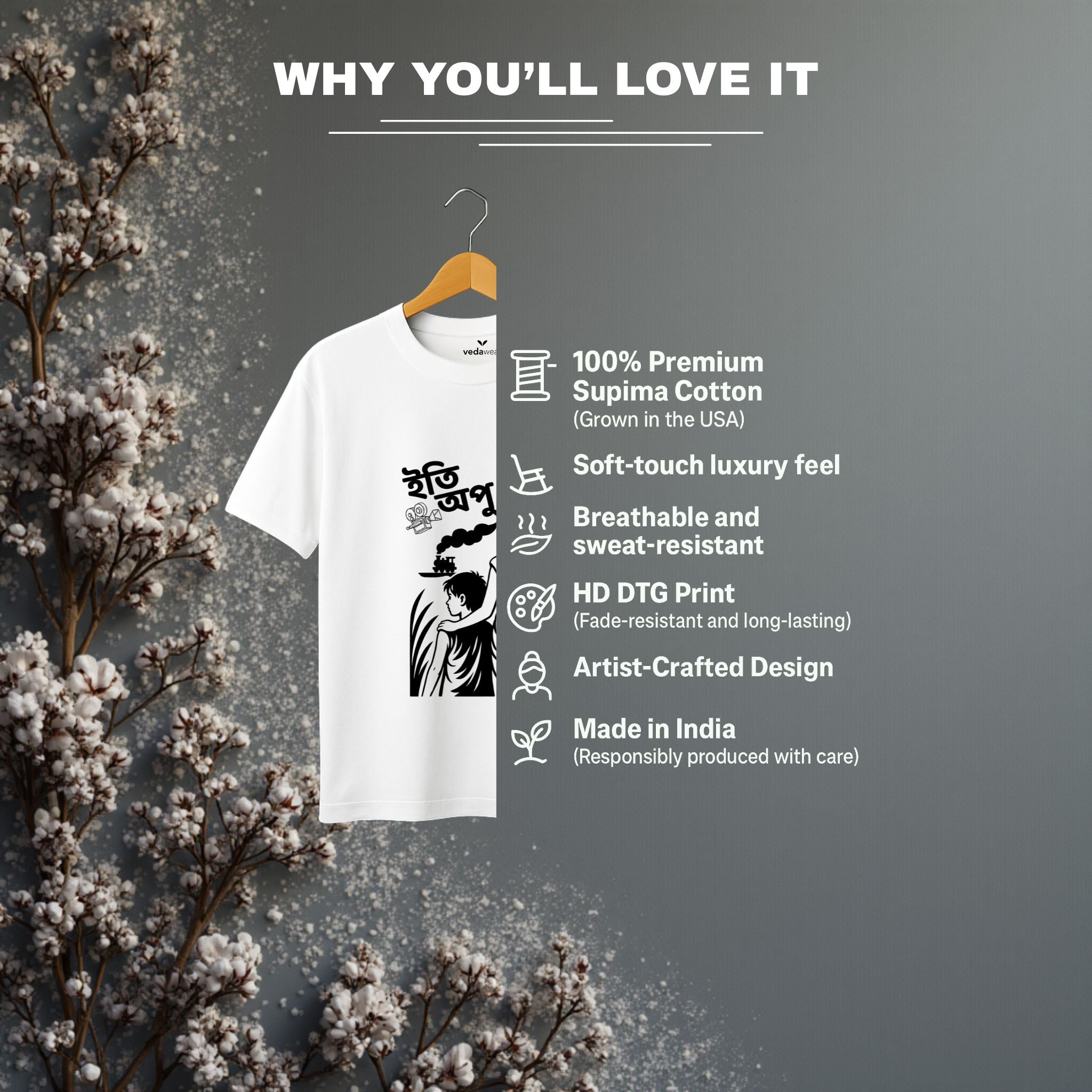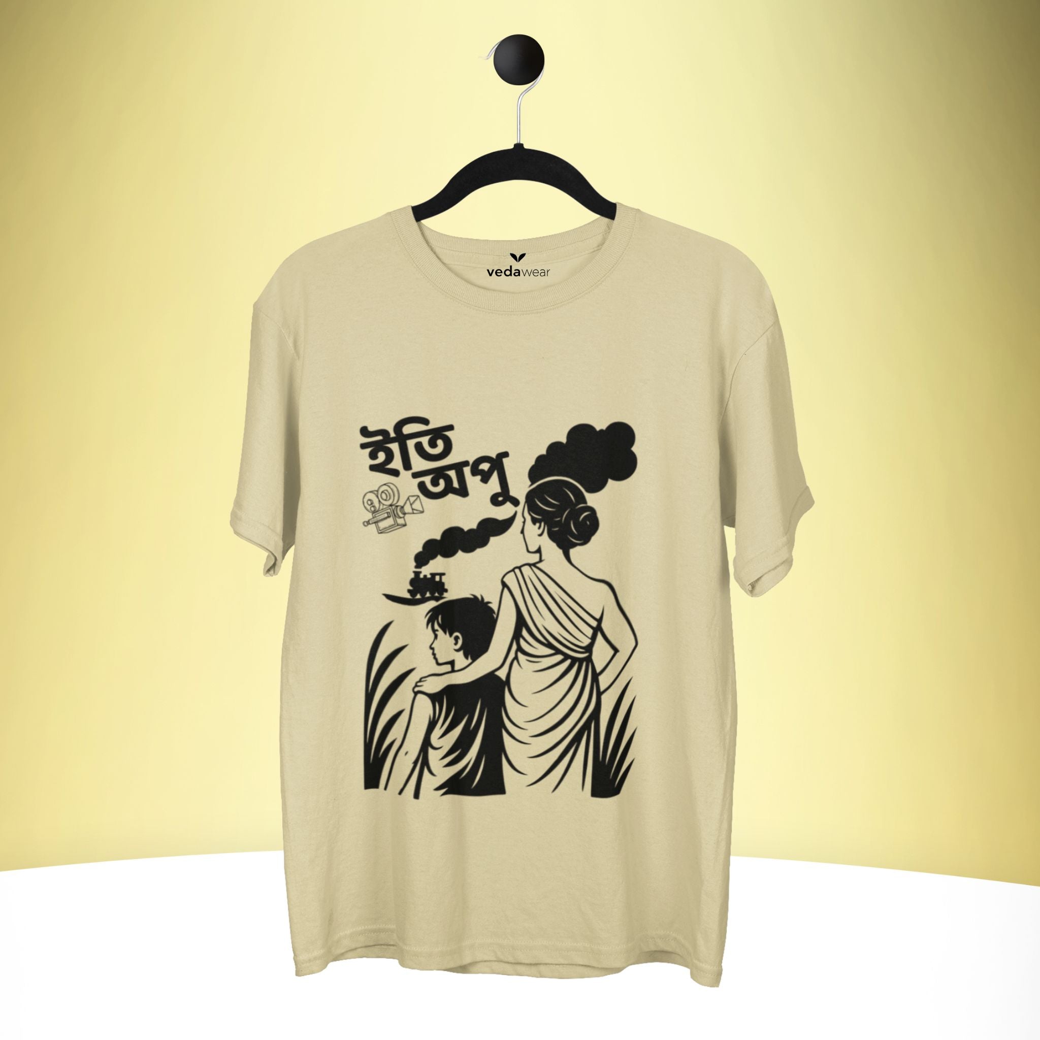 The “Iti Apu” premium tee by Vedawear is a heartfelt tribute to the bond between Apu and Durga, the beloved siblings from Bibhutibhushan Bandyopadhyay’s timeless novel Pather Panchali. The phrase "ইতি অপু" (Yours, Apu) is a quiet letter to memory, filled with warmth, simplicity, and emotional depth.