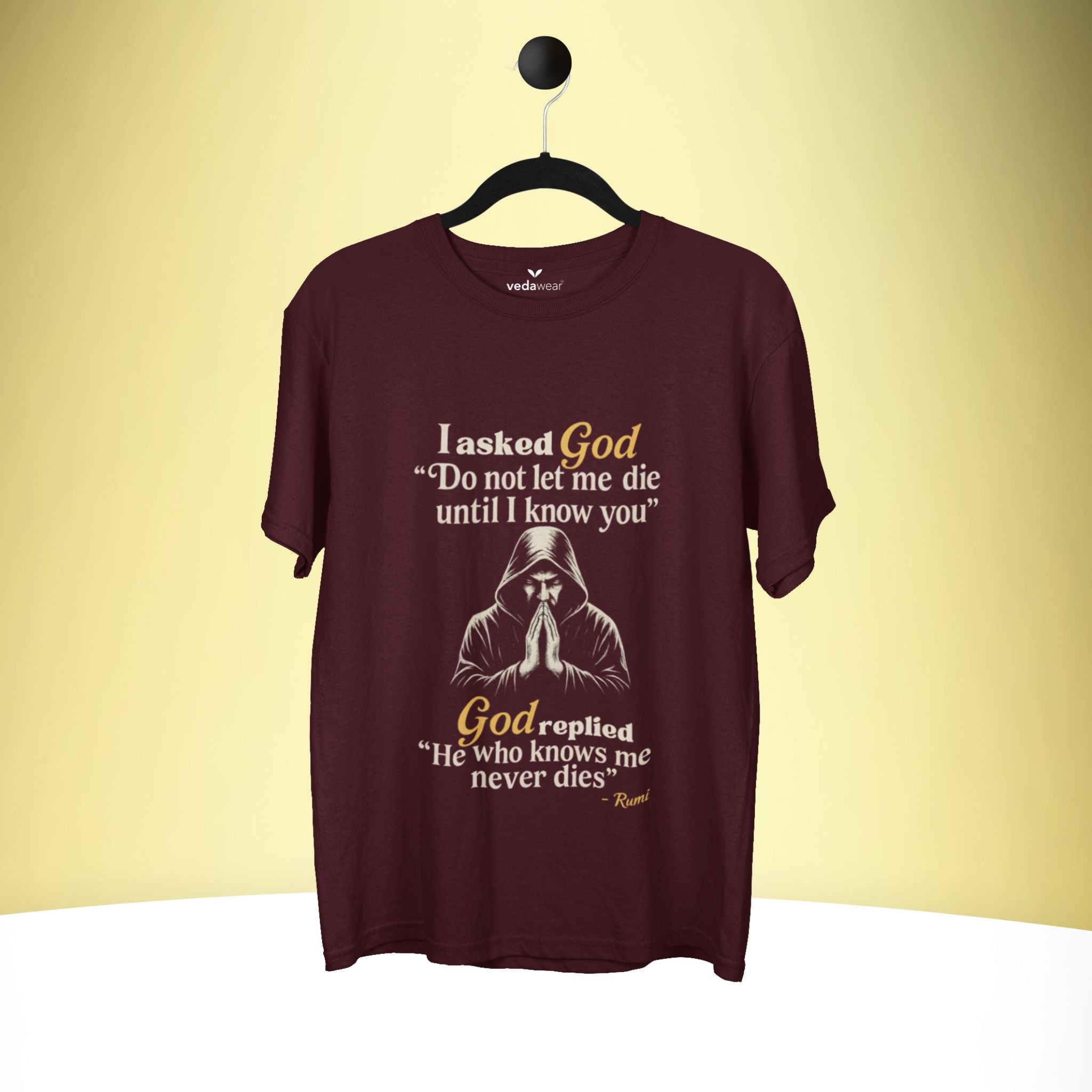 The “He Who Knows Me Never Dies” premium tee by Vedawear brings together mystical longing and divine wisdom through the words of Rumi—one of history’s most profound Sufi poets.