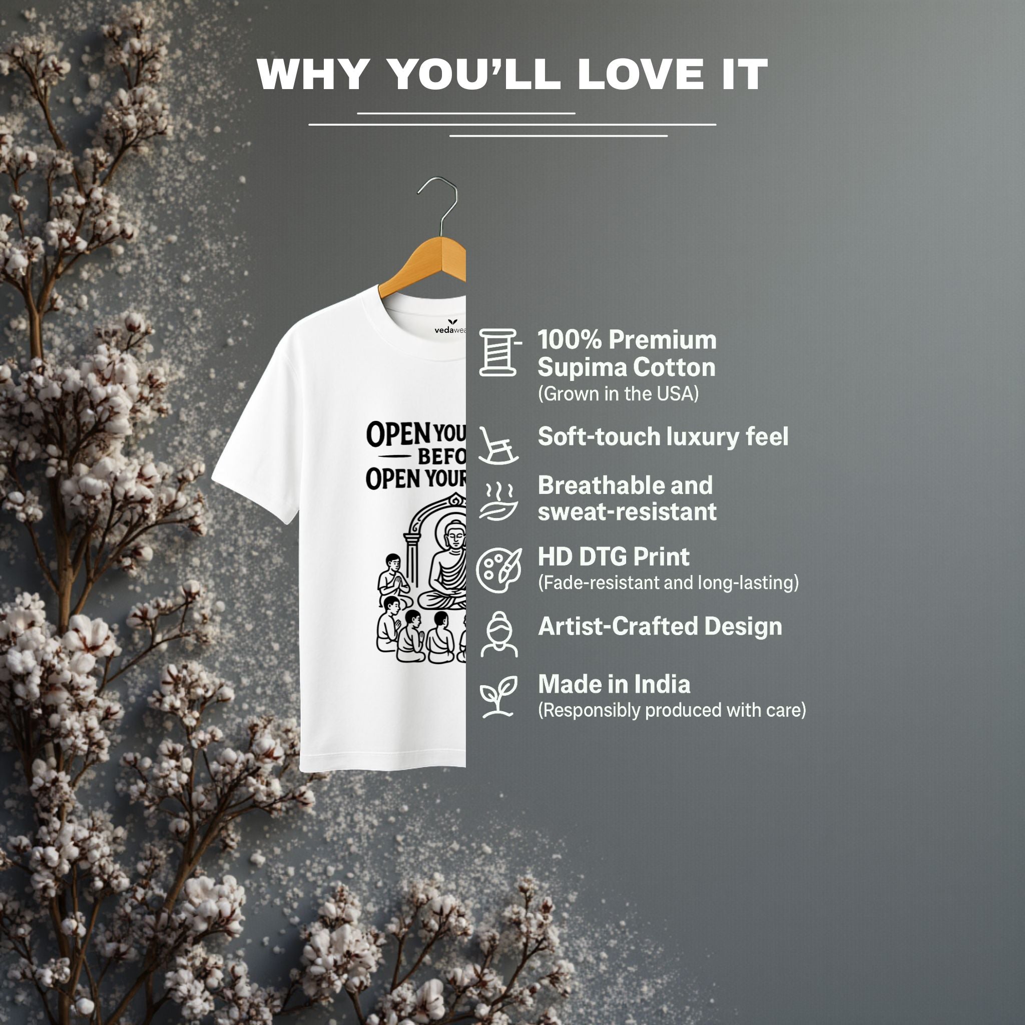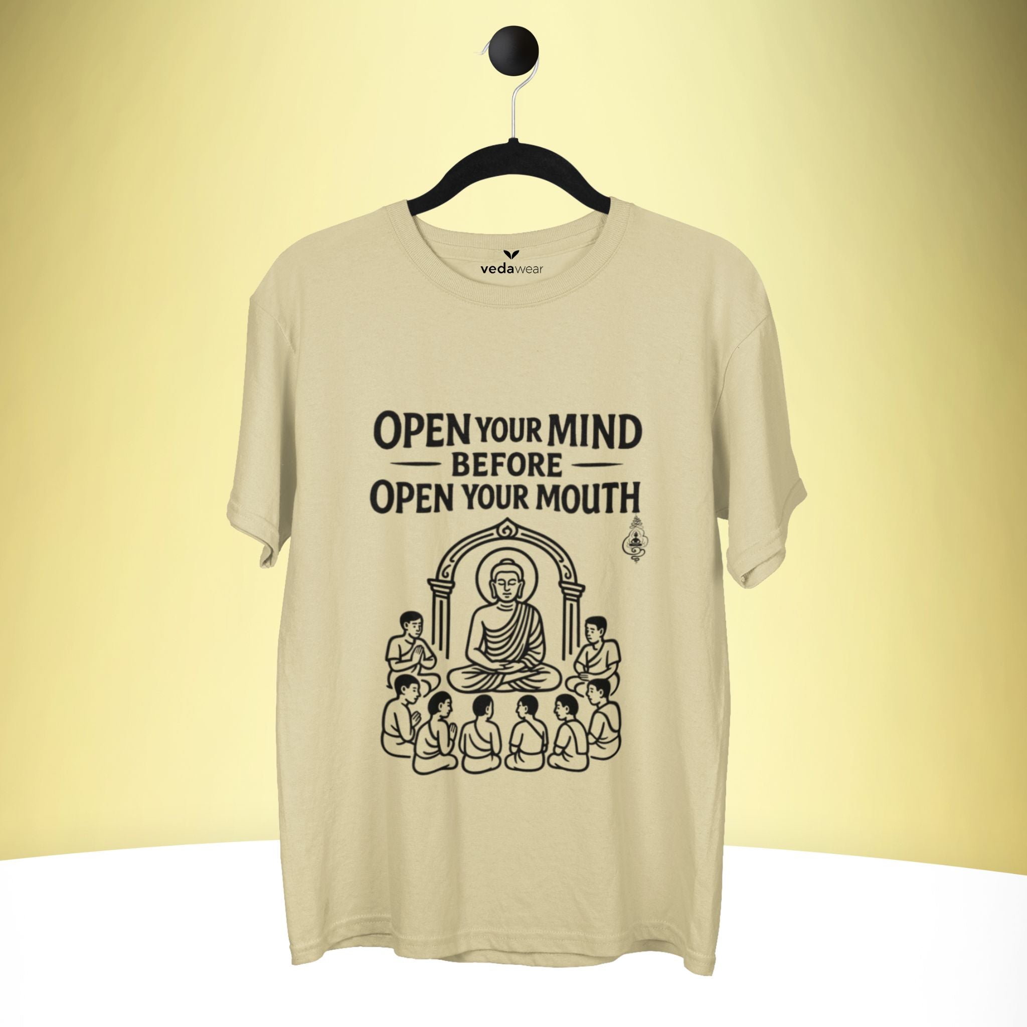 The “Open Your Mind Before You Open Your Mouth” premium tee from Vedawear channels ancient wisdom into a modern reminder of mindfulness.