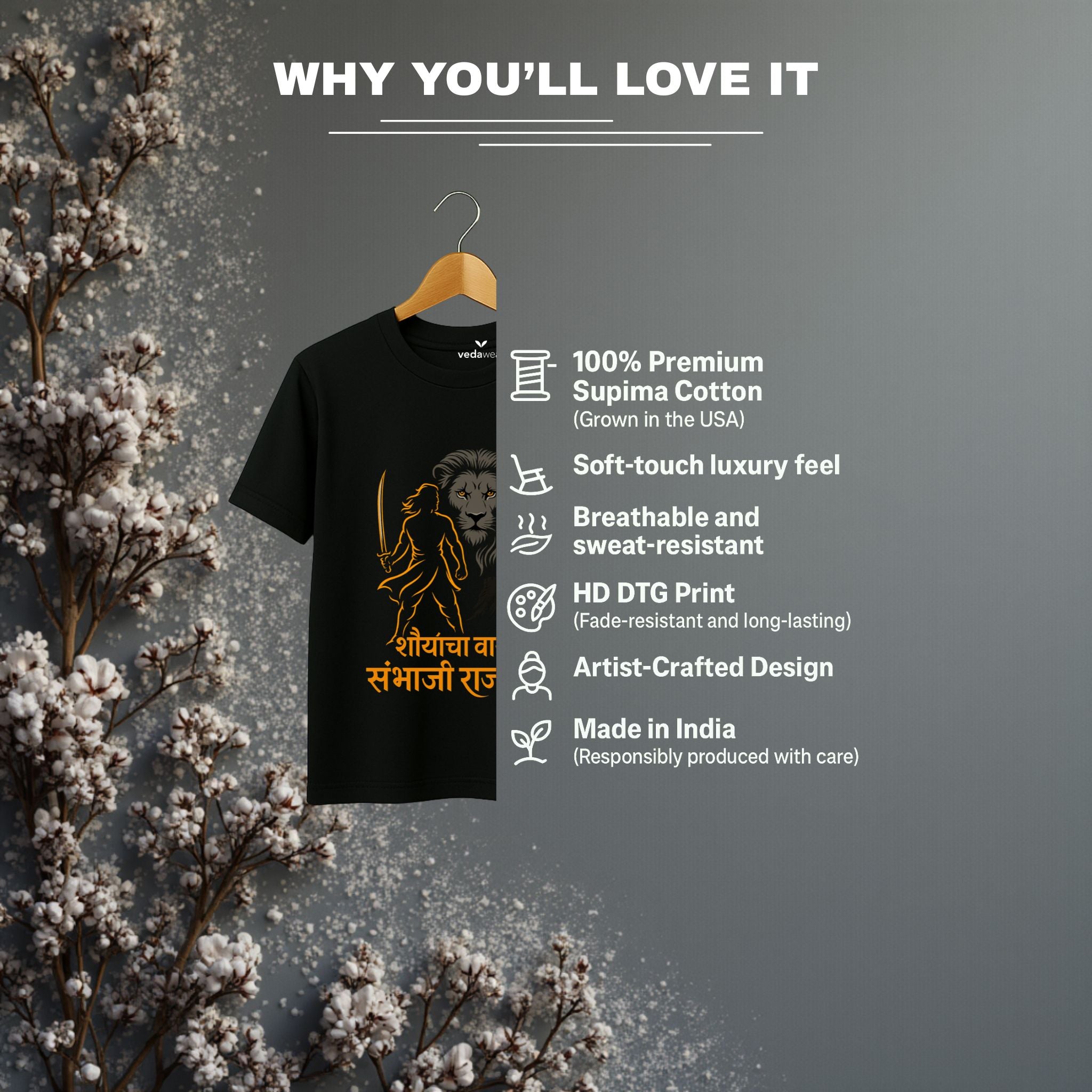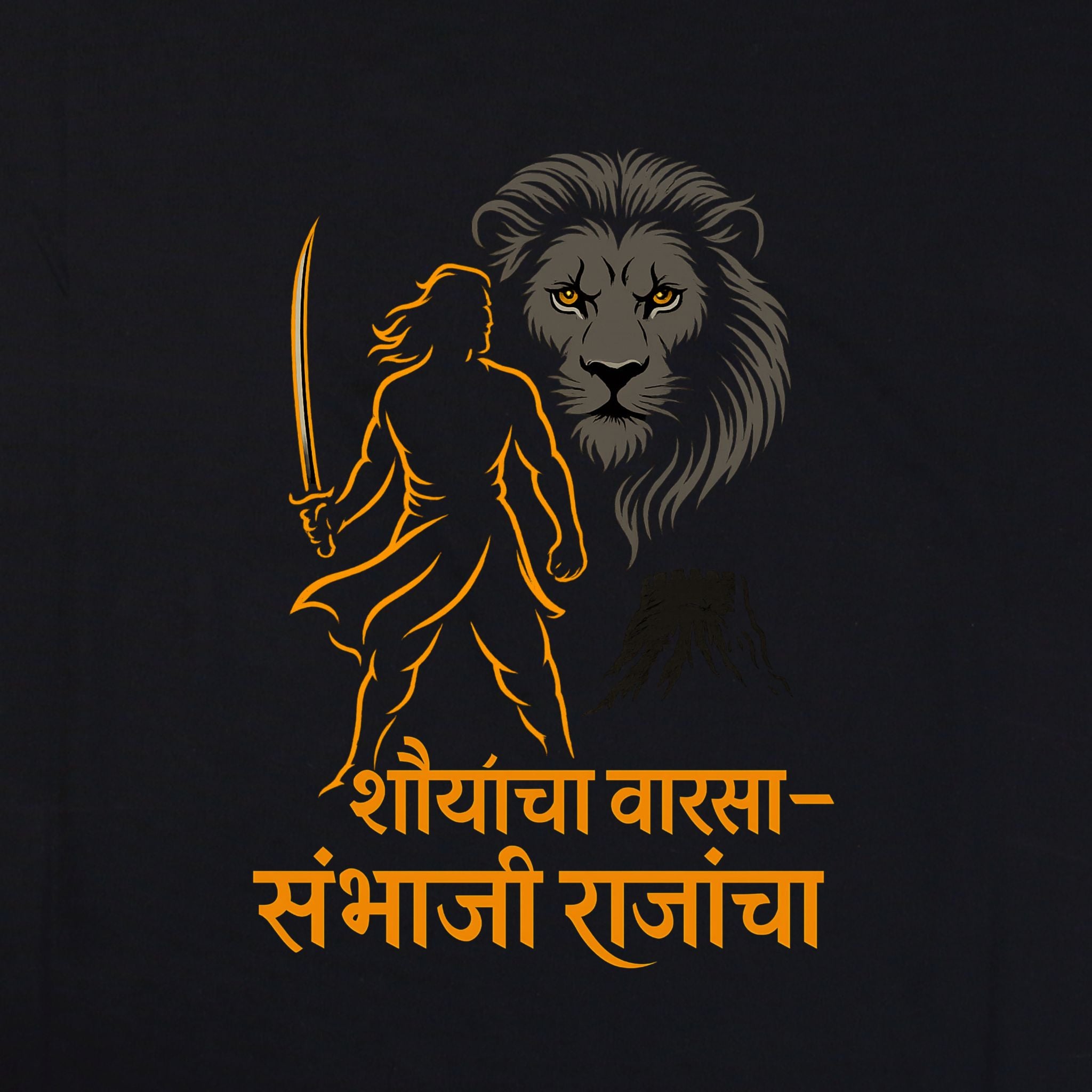 Honor the legacy of Chhatrapati Sambhaji Maharaj, the fearless Maratha warrior, with our Black Edition Premium Tee. Featuring a bold silhouette of Sambhaji Maharaj holding a gleaming sword, standing tall beside the majestic face of a lion — a timeless symbol of courage and power. The Marathi typography reads “शौर्याचा वारसा – संभाजी राजांचा”, meaning Heritage of Valor – Of Sambhaji Maharaj.