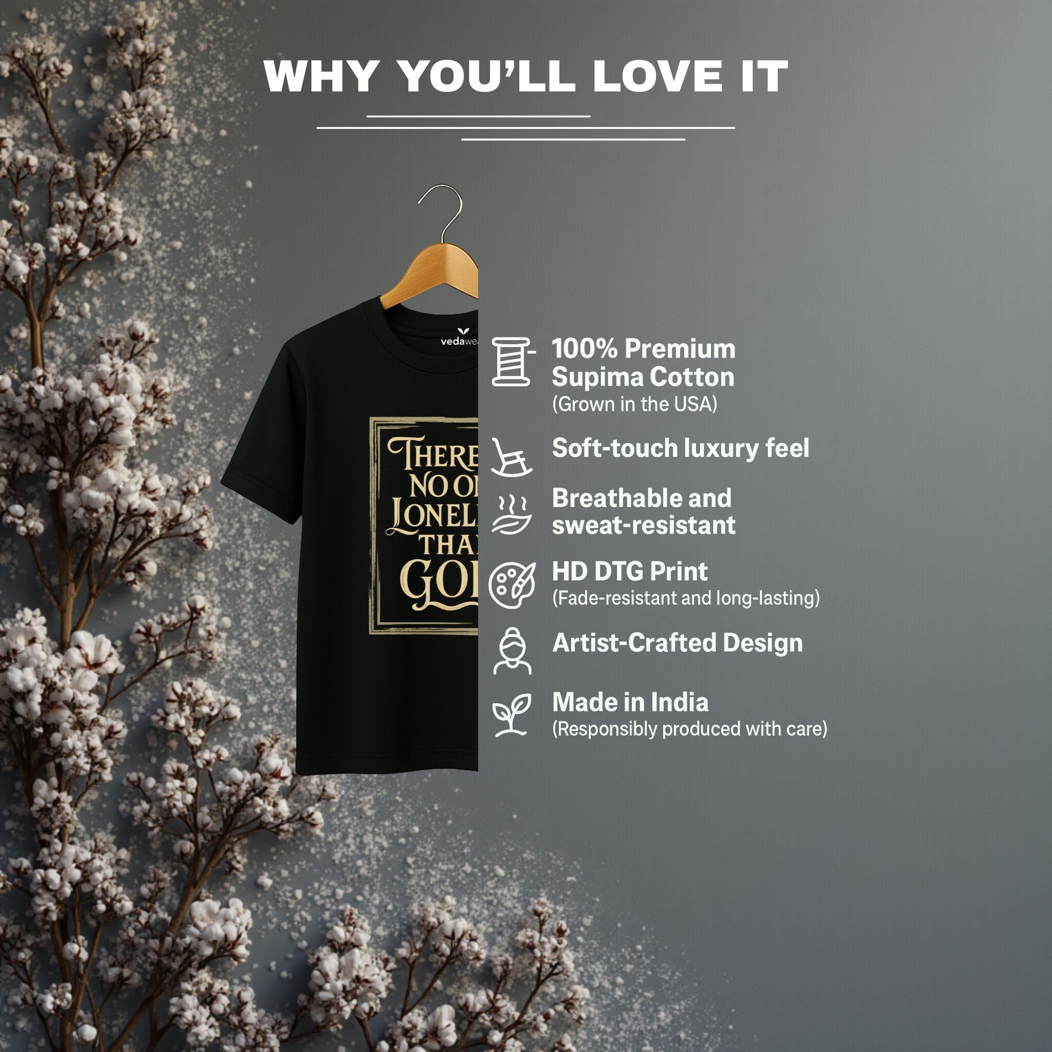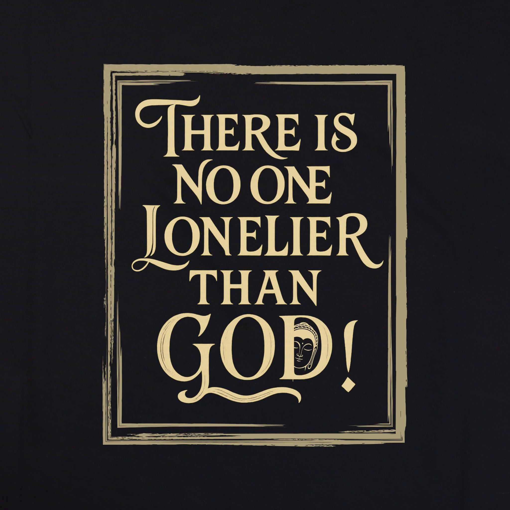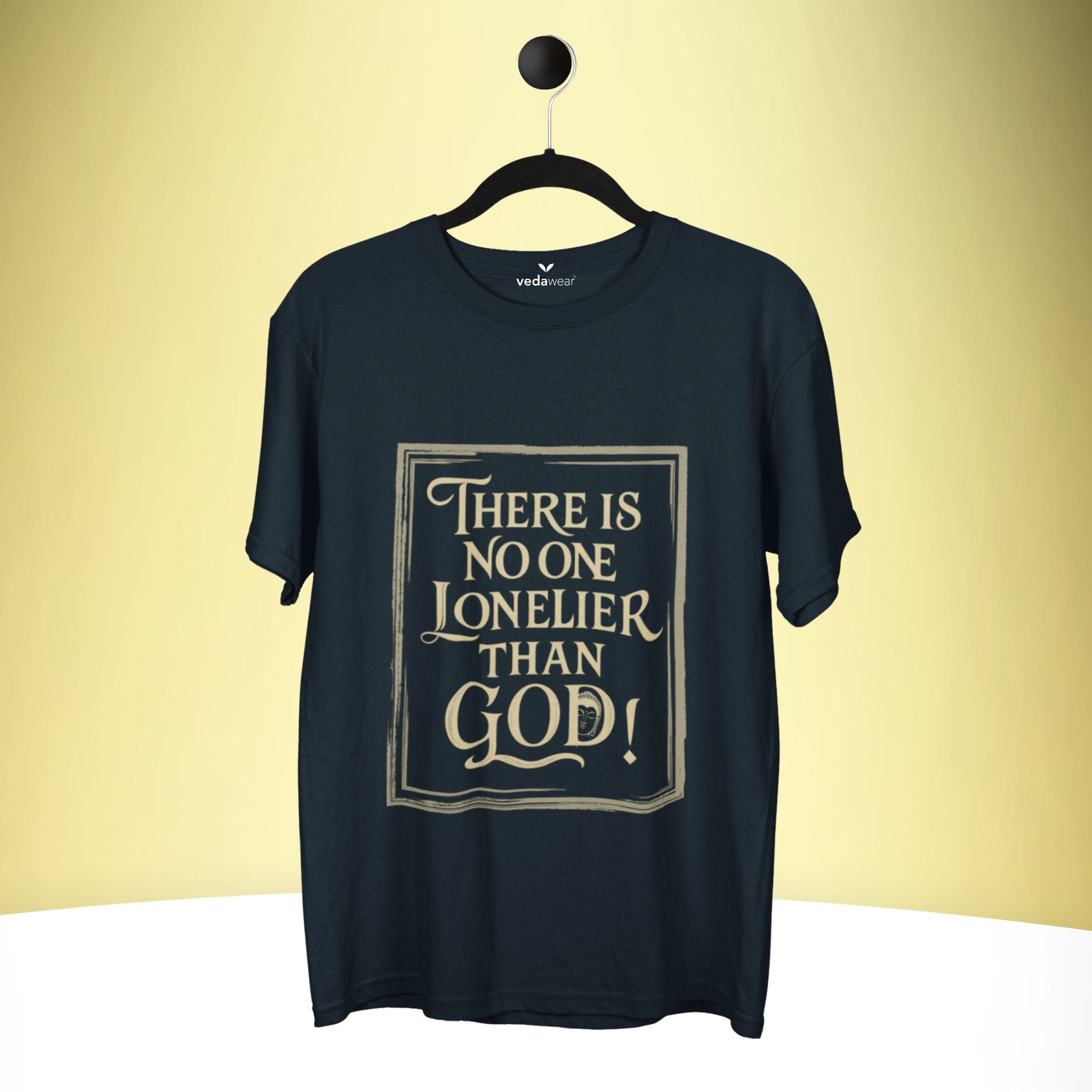 The artistic rendition of the quote, presented within an ornate, distressed frame, adds a layer of timeless elegance and visual intrigue. This design invites contemplation on universal concepts like isolation, creation, and existence, making it a unique expression of spiritual and intellectual apparel. It's a subtle yet powerful conversation starter, embodying the Vedawear ethos of wearing your wisdom. Elevate your wardrobe and your mind. Add 'The Loneliest God' Supima Cotton T-Shirt to your collection and wear your profound perspective.