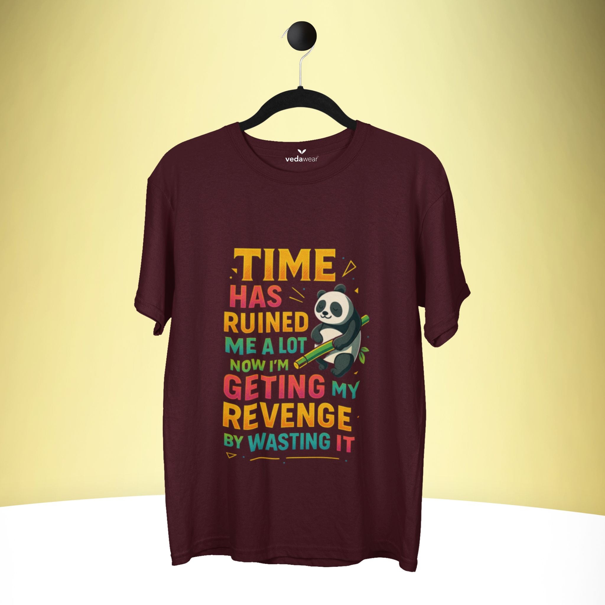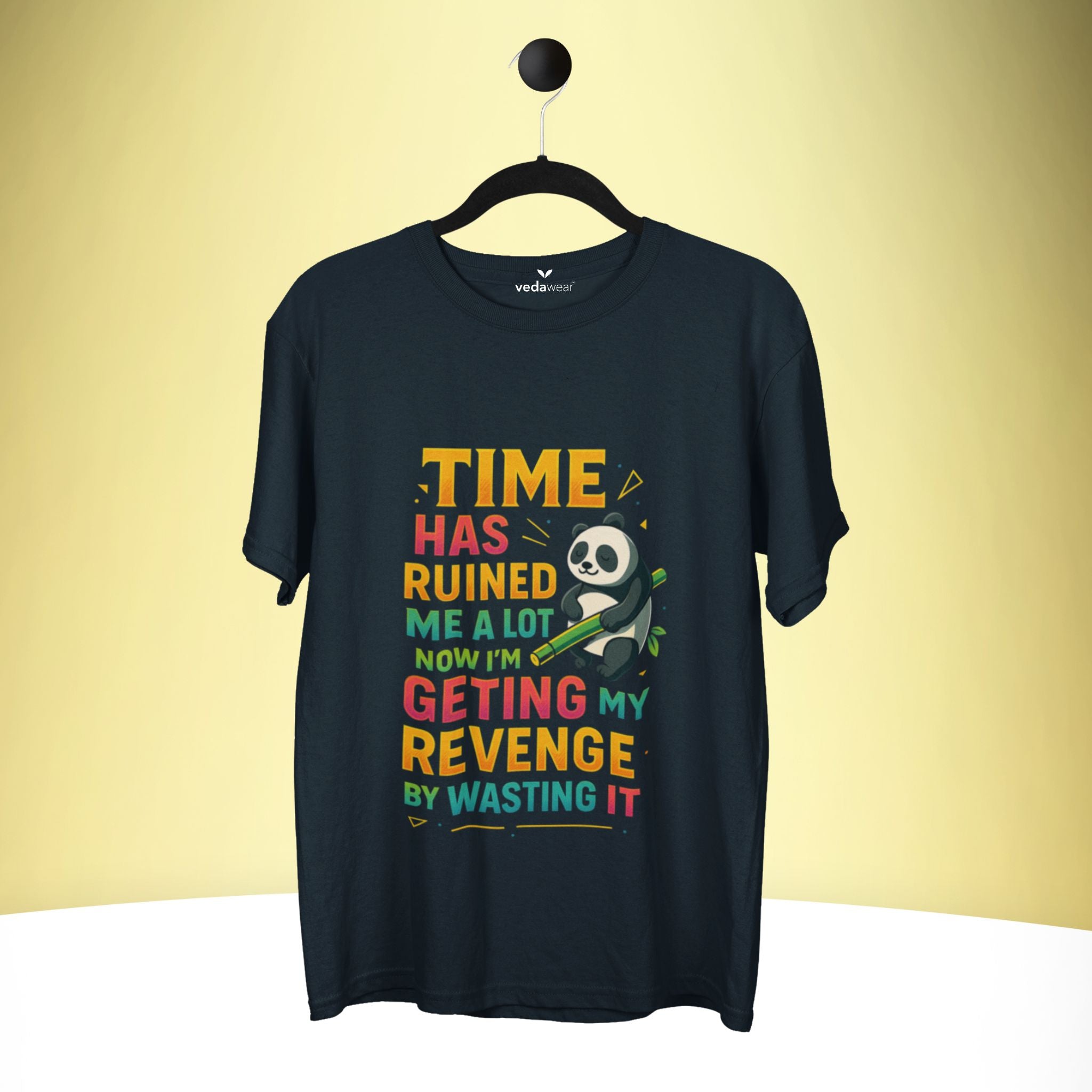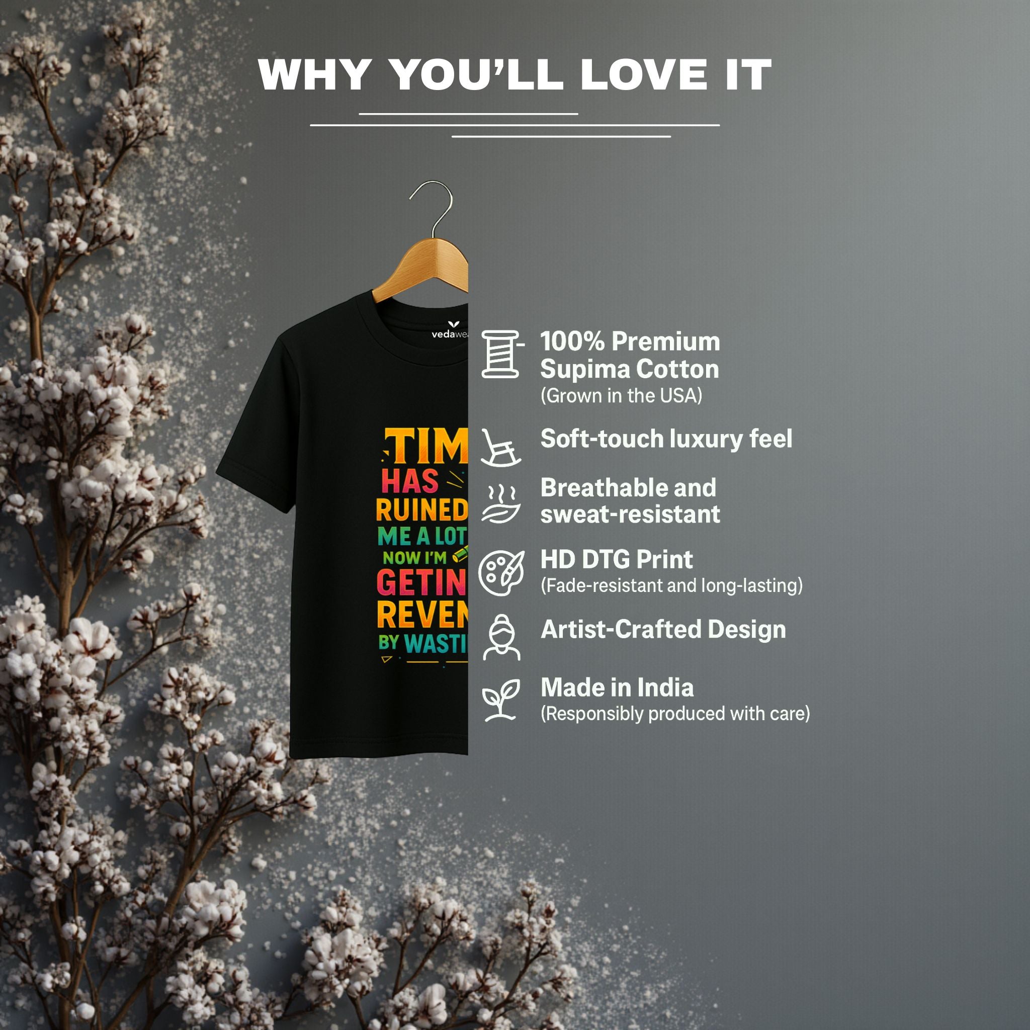 The “Time Ruined Me” premium tee by Vedawear is a tongue-in-cheek masterpiece for those who’ve had enough of being productive. The quote says it all: