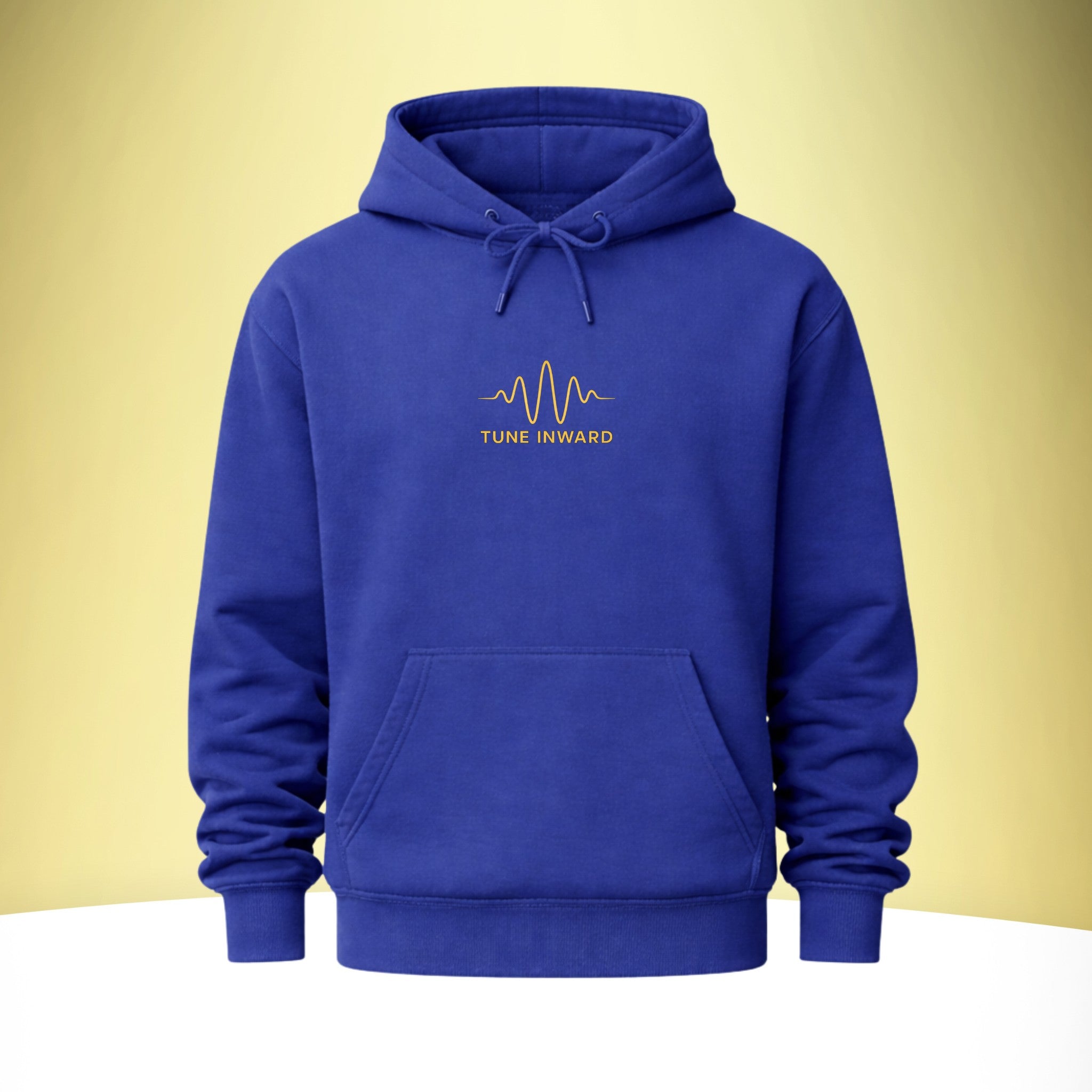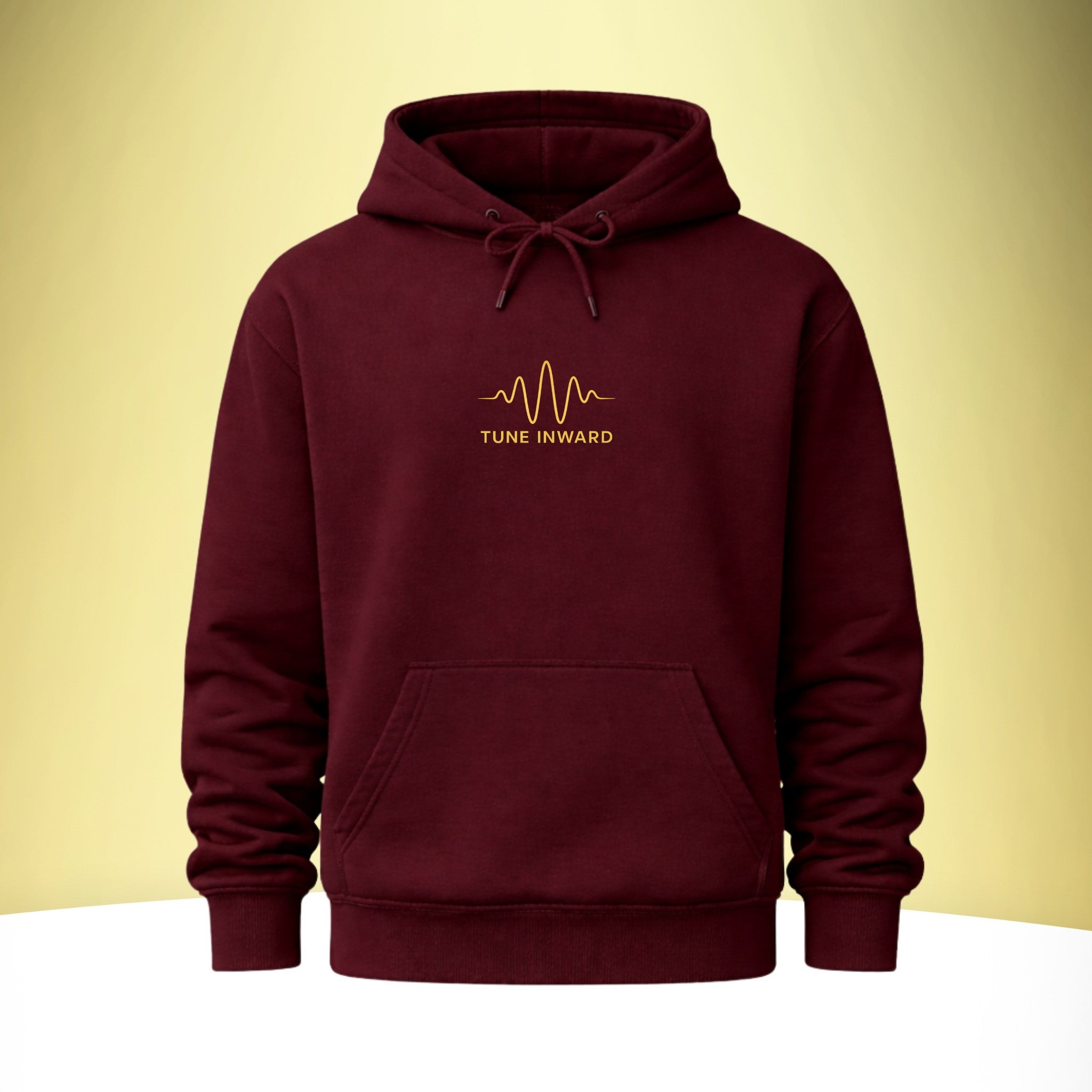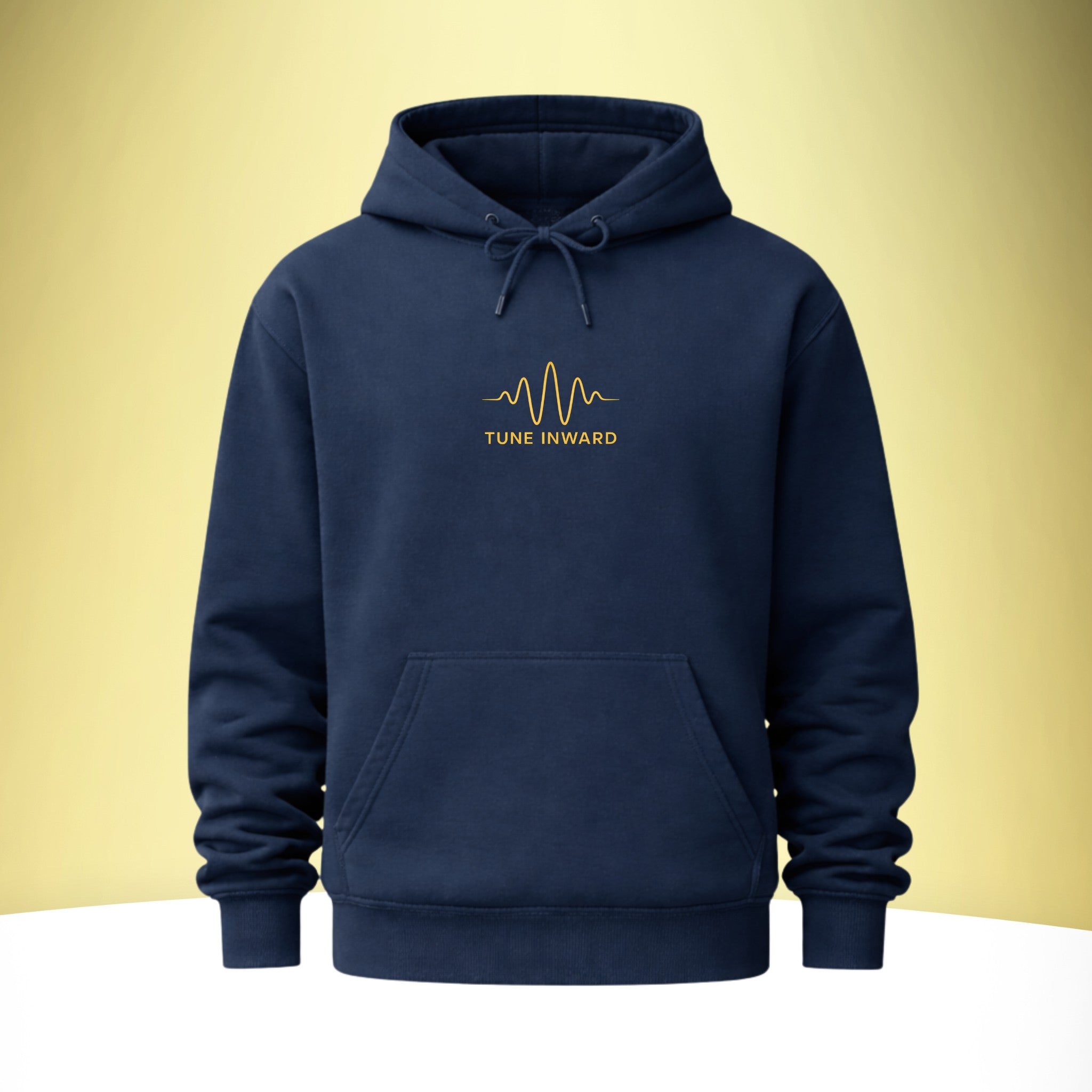 A premium hoodie designed to help you slow down, tune inward and find your calm. The front carries a clean gold waveform, and the back features a meditative silhouette with a deep Sanskrit line about inner peace. Soft, minimal and made for everyday comfort.